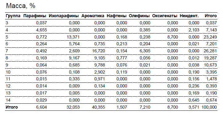 Нет. Сейчас табличку данные полученные добавлю Масса, % Группа Парафины Изопарафины Ароматика Нафтены Олефины Оксигенаты Неидент. Итого 3 0,037 0,000 0,000 0,000 0,000 0,000 0,000 0,037 4 4,655 0,000 0,000 0,000 0,385 0,000 2,103 7,143 5 0,772 13,371 0,000 0,168 0,238 8,700 0,000 23,249 6 0,264 5,764 0,735 0,213 0,204 0,000 0,021 7,201 7 0,492 2,609 16,720 0,154 6,305 0,000 0,000 26,281 8 0,169 9,167 9,105 0,777 0,056 0,000 0,012 19,287 9 0,064 0,685 9,788 0,076 0,021 0,000 0,038 10,673 10 0,076 0,108 2,902 0,119 0,000 0,000 0,190 3,395 11 0,015 0,335 0,971 0,000 0,000 0,000 0,156 1,478 12 0,014 0,009 0,134 0,000 0,000 0,000 0,236 0,393 13 0,017 0,005 0,000 0,000 0,000 0,000 0,169 0,190 14 0,029 0,000 0,000 0,000 0,000 0,000 0,645 0,674 Итого 6,604 32,053 40,355 1,507 7,210 8,700 3,571 100,000 Немного сместилась таблица. Не понятно группы (первый столбец) от 3 до 14, что в них характеризуется? Спасибо и простите за тупость) |